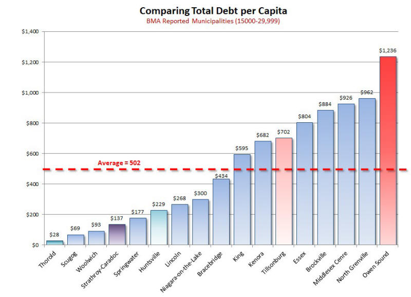 So, what do the results shown in figure 16 actually mean? Well, it clearly shows that Owen Sound is carrying an abnormally large debt load as compared to other municipalities with populations between 15,000 and 29,999. Owen Sound has a total debt of $1,236 per resident. This is $734 per resident greater than the average of $502 per resident. The nearest municipality from the study group, is Tillsonburg, which has a total debt per capita of $702 per resident which is only 56% of Owen Sound 's.