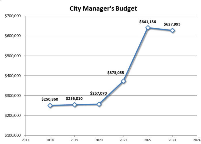 Figures 17 and 18 show two examples of excessive budget growth that exemplify the problem of spending growth at city hall. In regard to the city manager 's his budget grew by 150% in just two years.