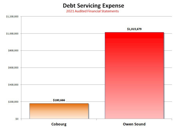 Amortization is an accounting method for spreading out the costs for the use of a long-term asset over the expected period the long-term asset will provide value. Figure 14 above shows the Amortization Expense for Owen Sound and municipality of Cobourg. This essentially means both municipalities have made similarly sized capital investments. Figure 15 shows that Owen Sound 's Debt Servicing Expense is significantly greater than Cobourg 's. Conversely, Cobourg spends only 17.8% of what Owen Sound spends annually to service its debt. This can only mean that Owen Sound has had to assume much more debt to fund those capital investments. The average debt servicing expense for the three primary comparators was only $235,240 in 2021 which is only 23.1% of what Owen Sound spends annually.
