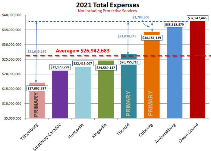 The chart shown in figure 11 was created using each municipality 's Audited Financial Statements. It 's interesting to note that Owen Sound spends $11.0 million more than the average of the 3 primary comparator municipalities to provide services. When we consider only the closest comparator, Cobourg, we see that Owen Sound spends $3.8 million more on services than Cobourg. Therefore If Owen Sound reduced expenses to match only those of Cobourg, Owen Sound taxpayers would realize an 11.9% reduction in taxes.