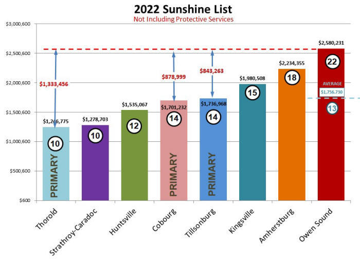 The Ontario Sunshine List sheds some light on why Owen Sound 's Salaries and Benefits expense is so much greater than the other municipalities. We see in figure 19 that Owen Sound has 22 non-protective services employees making $100,000 or more. Owen Sound total of 22 employees; which is 9 employees or more than the 12.6 average of the three primary comparators. This is costing taxpayers $823,501 more on top salaries than average municipality in the primary comparator group. This suggests that the highest salaried employees, normally senior management, contribute 21.1% of the excessive salary and benefits expense.