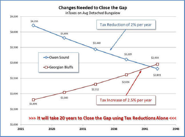 As shown in the graph above, if we were to have successive annual tax reductions of 2%, and Georgian Bluffs were to increase their taxes on average by 2.5%, it would take 20 years to completely close the gap. So in order to reduce the gap over a reasonable time period, it will also require one-time reductions in expenses, in addition to annual tax reductions.