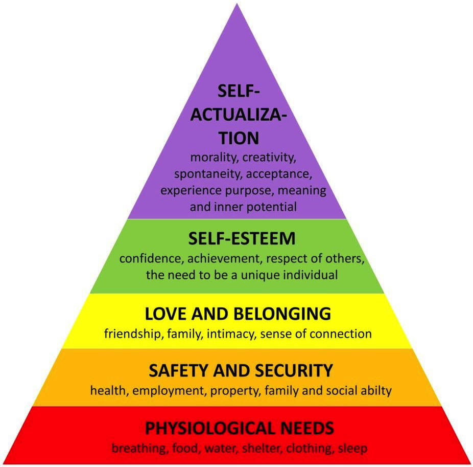 Cultural enrichment and the arts fall primarily into the upper levels of this hierarchy - they represent self-actualization, creative expression, and community identity. These are valuable pursuits, but only after lower-level needs are met.