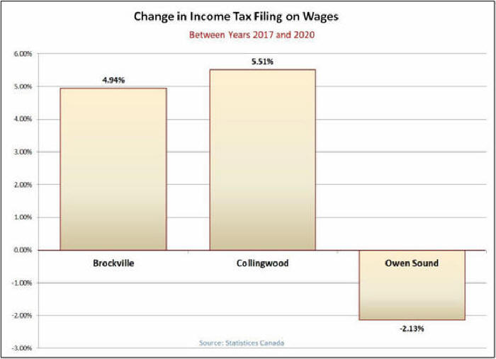 One of the hidden impacts of the excessive growth in taxes that Owen Sound has experienced over the last twenty years is that people have been moving away to avoid hig property taxes or unaffordable rents. The population of those filing income tax on wages between 2017 and 2020 grew by 5.51% in Collingwood and shrank by 2.13% in Owen Sound. In all likelihood, wage earners are just moving across municipal boundaries to reduce one of the growing strains on their family finances – high Owen Sound Taxes. After all they can continue to enjoy everything that Owen Sound has to offer while living in Georgian Bluffs or just East of 28th avenue in Meaford. They can continue to do all of this and reap the benefits of much lower taxes that Georgian Bluffs and Meaford has to offer. We can see this when we look at the change in those filing income taxes between 2012 and 2020 as shown in graph above.