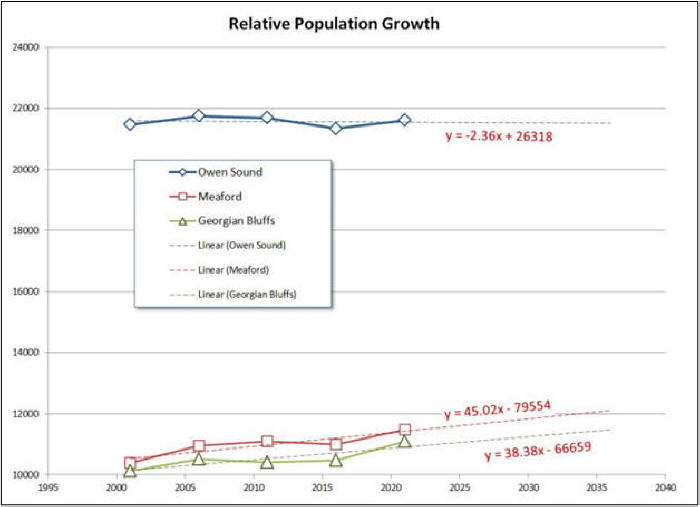 Theoretically there will be a time when both Georgian Bluffs and Meaford have greater populations than Owen Sound. Just think about that for a minute – Owen Sound will be smaller than Meaford at some time in the future if things continue on the same path.