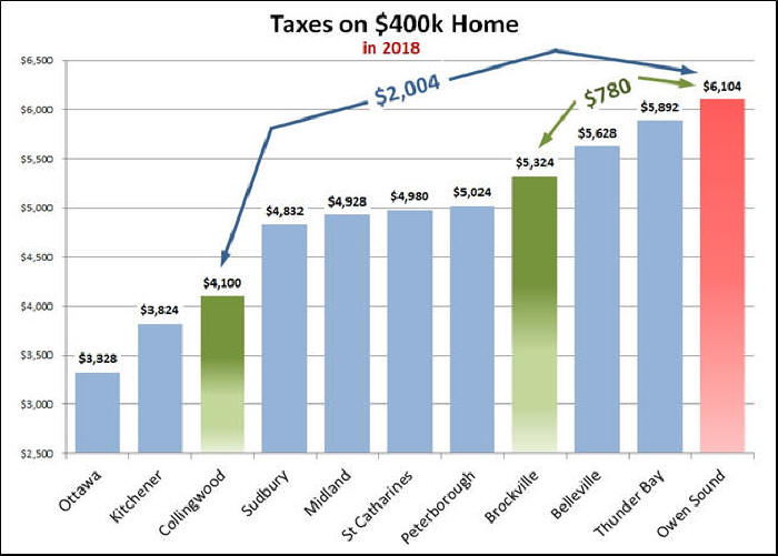 Owen Sound taxpayers are one of the highest taxed populations in Ontario as shown. The graph above shows the relative taxes on a $400,000 home. If you were fortunate enough to own a $400,000 home, you would save over $2,000 per year if you were to move your house to Collingwood or $780 per year if you moved it to Brockville, which has almost identical population to Owen Sound.
